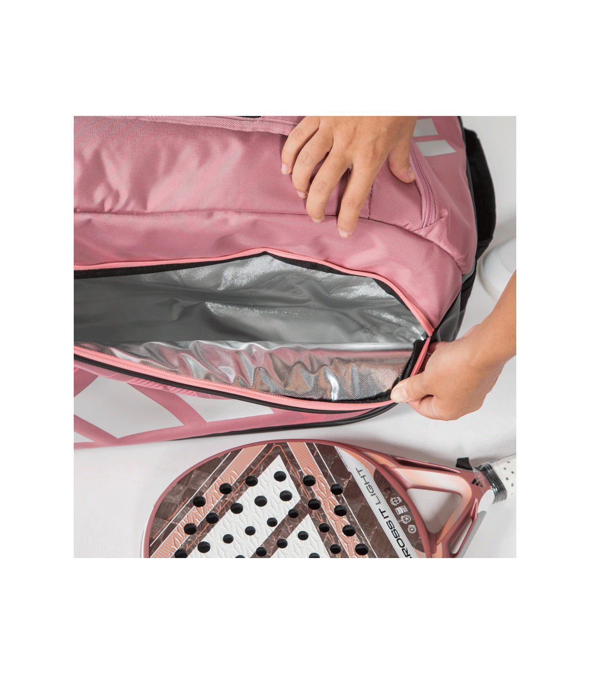 El compartimento exterior para palas integra una estructura semirrígida con aislamiento térmico, diseñada para que cada pala quede perfectamente ajustada. Esta construcción ayuda a protegerla frente a cambios de temperatura y a preservar su rendimiento.